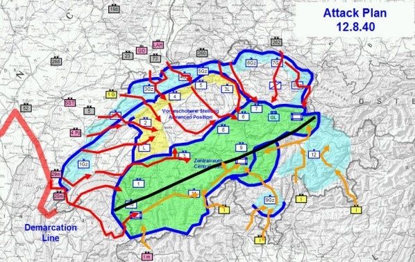 L'Allemagne a commencé à planifier l'invasion de la Suisse le 25 juin 1940, jour de la reddition de la France. Reconnaissant que la Suisse et le Liechtenstein étaient encerclés par la France occupée et les puissances de l'Axe, Guisan publia Operationsbefehl Nr. 10, une refonte complète des plans défensifs suisses existants. Dans ce plan, la Forteresse Saint-Maurice (en), le col du Saint-Gothard au sud et la forteresse Sargans au nord-est serviront de ligne de défense. Les Alpes seraient la forteresse des suisses . Les 2e, 3e et 4e Corps d'armée suisses devaient retarder les actions à la frontière, tandis que tous ceux qui le pouvaient devaient se retirer dans le refuge alpin connu sous le nom de Réduit national. Les centres de population étaient cependant tous situés dans les plaines du nord du pays. Il faudrait les abandonner aux forces allemandes pour que le reste du pays puisse survivre.