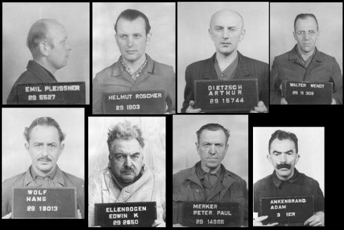Les huit officiers américains du tribunal militaire américain au procès des anciens membres du personnel du camp de Buchenwald. De gauche à droite: Lieutenant-colonel Morris, Colonel Robertson, Colonel Ackerman, Brigadier général Kiel, Lieutenant-colonel Dwinell, Colonel Pierce, Colonel Dunning et le Lieutenant-colonel Walker.